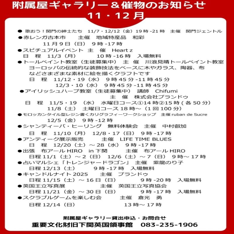 附属屋ギャラリーの2025年11月・10月の予定をお知らせします。是非、興味のある方は来館ください♥